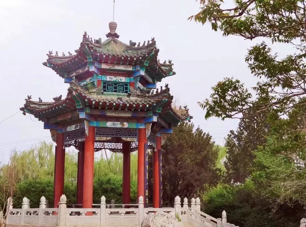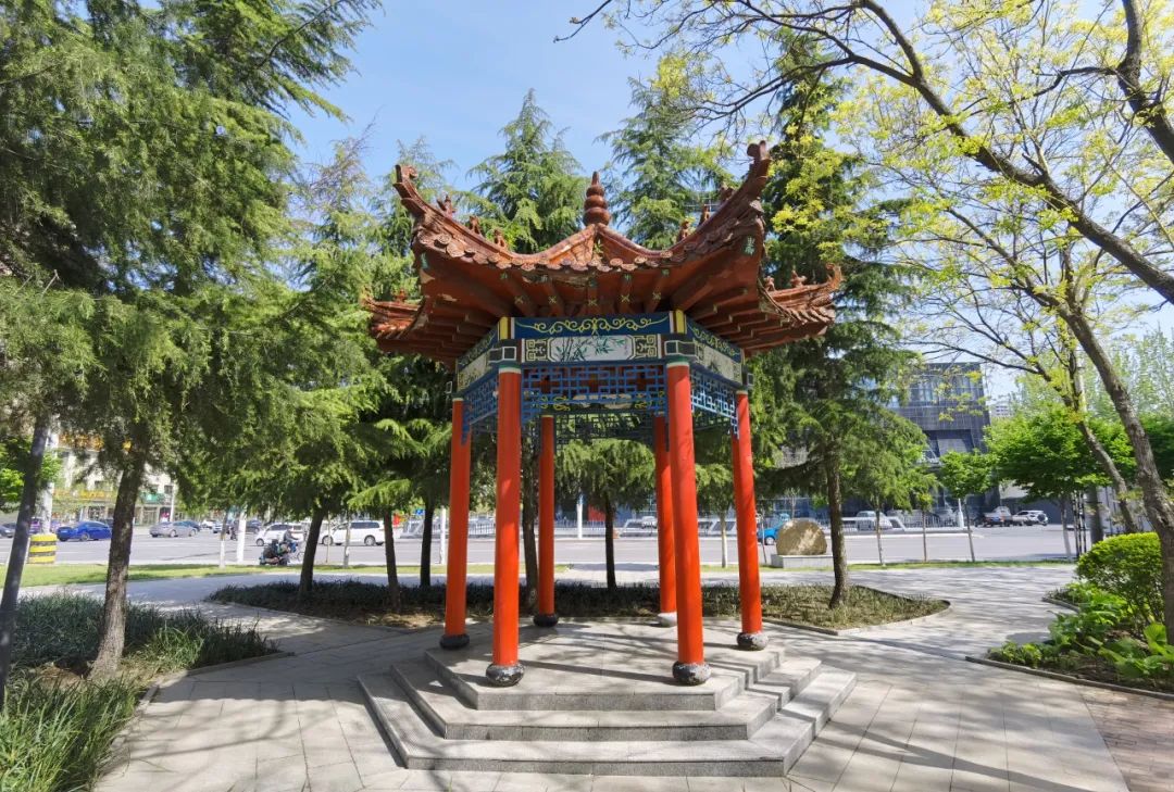 寿光市仓圣公园的亭子则是重檐六角攒尖亭,相较单檐,重檐在轮廓线上更为丰富,结构上也稍有复杂,在仓圣公园这种规模较大的园林中,采用重檐式亭较多,亭子翘角的起翘比较轻微,显得平缓、持重。亭子整体置于用石块堆叠成的假山之上,配植以花草,营造登高望远的氛围感。