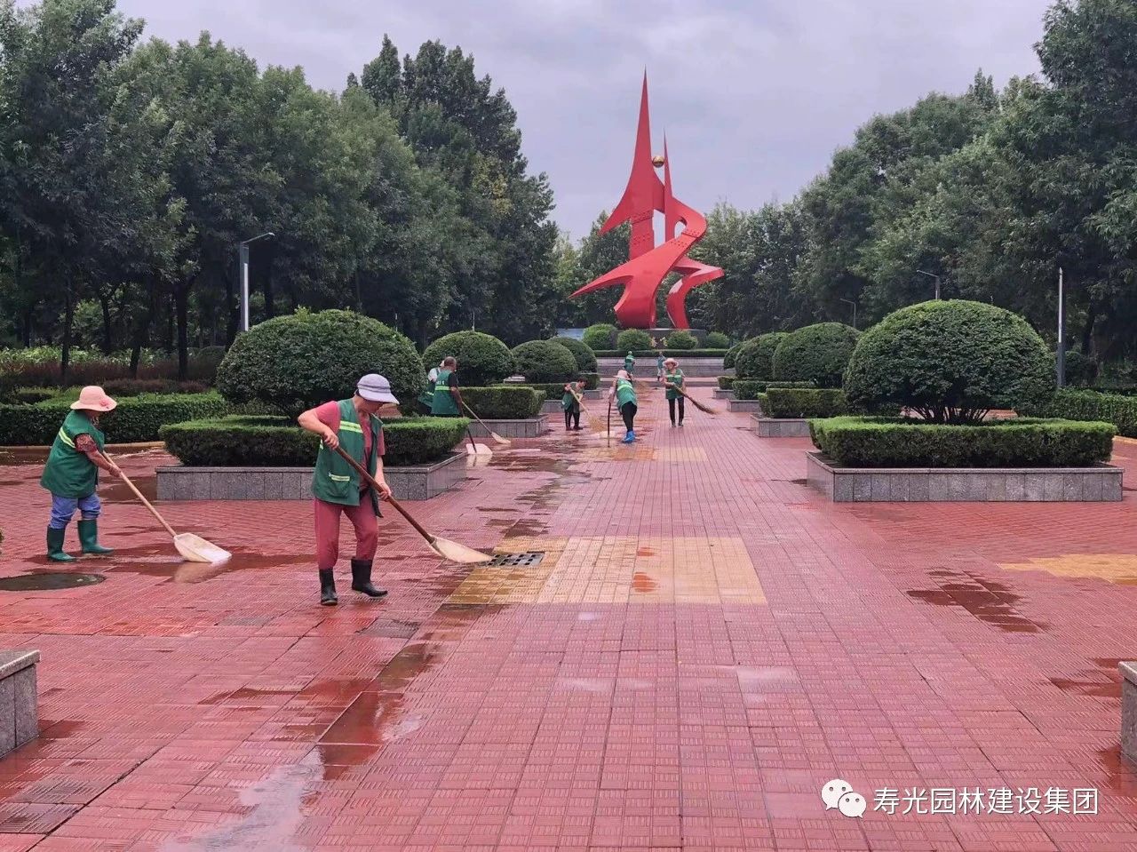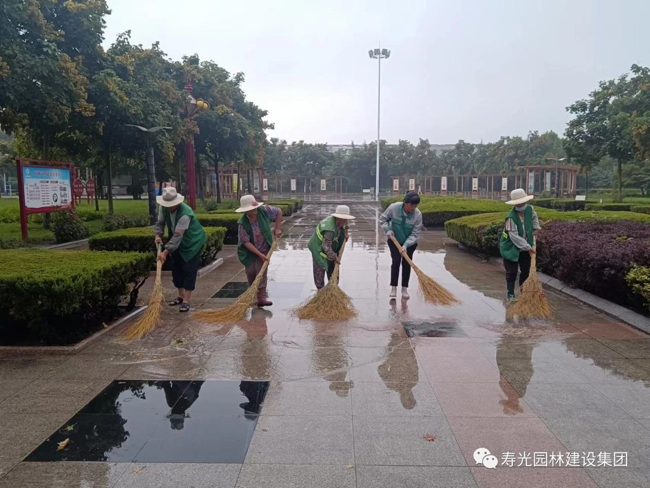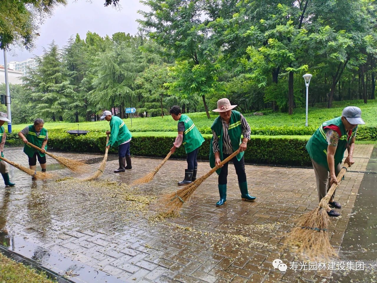 每次雨情,对园林工作来说都是一次随机考试。为应对恶劣天气,寿光园林建设集团制定了科学规范的应急机制,雨中不间断巡查园区及道路绿地,防止断枝、倒伏树木给交通出行造成影响;对落叶、落花密集区域加大清扫力度,并及时清运,避免积水;雨后及时进行园区清扫,保障园区环境洁净,这已经成为园林工人的一项常态化工作。