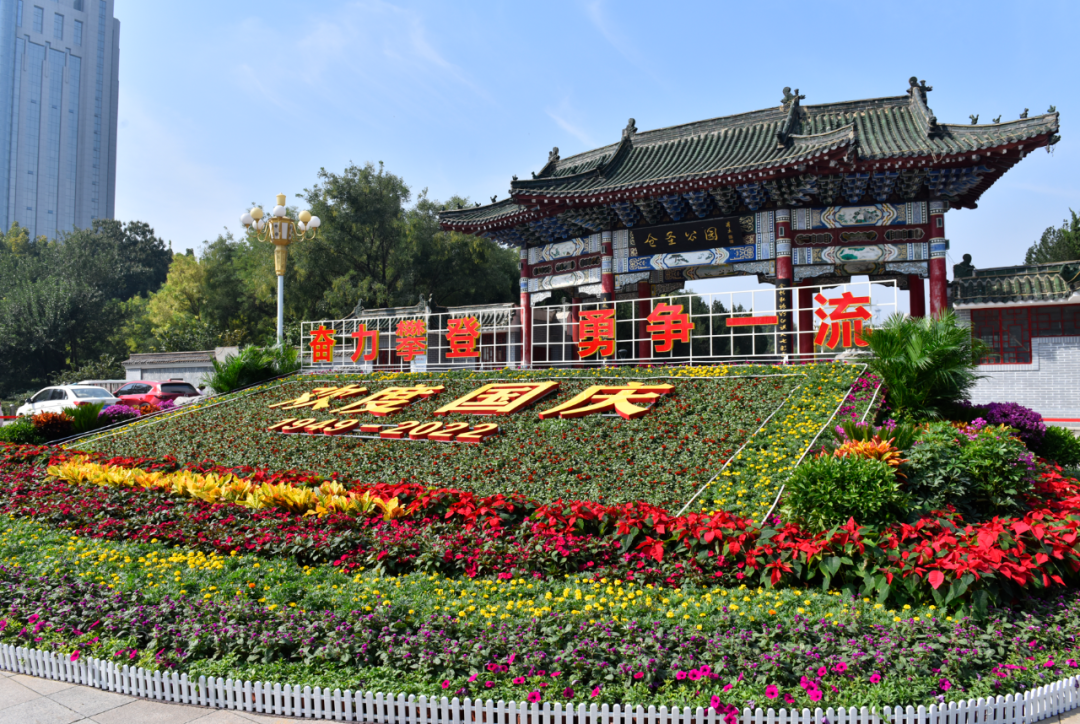 在商务小区入口广场,一个巨大的红色灯笼迎风而立,上面写着“祝福祖国”四个大字,灯笼下方是以万寿菊、三角梅、铁树、海棠花、彩叶草等鲜花、绿植构成的花境,一朵朵、一盆盆,在风中摇曳生姿,美不胜收。此处花坛以中国传统元素之一的红灯笼为主景,大红灯笼渗透着中华民族特有的丰富文化底蕴,灯笼基部的心寓意着我心向党,喜庆二十大奋进新征程,体现了全市人民全心全意跟党走奔向美好明天的坚定信念。