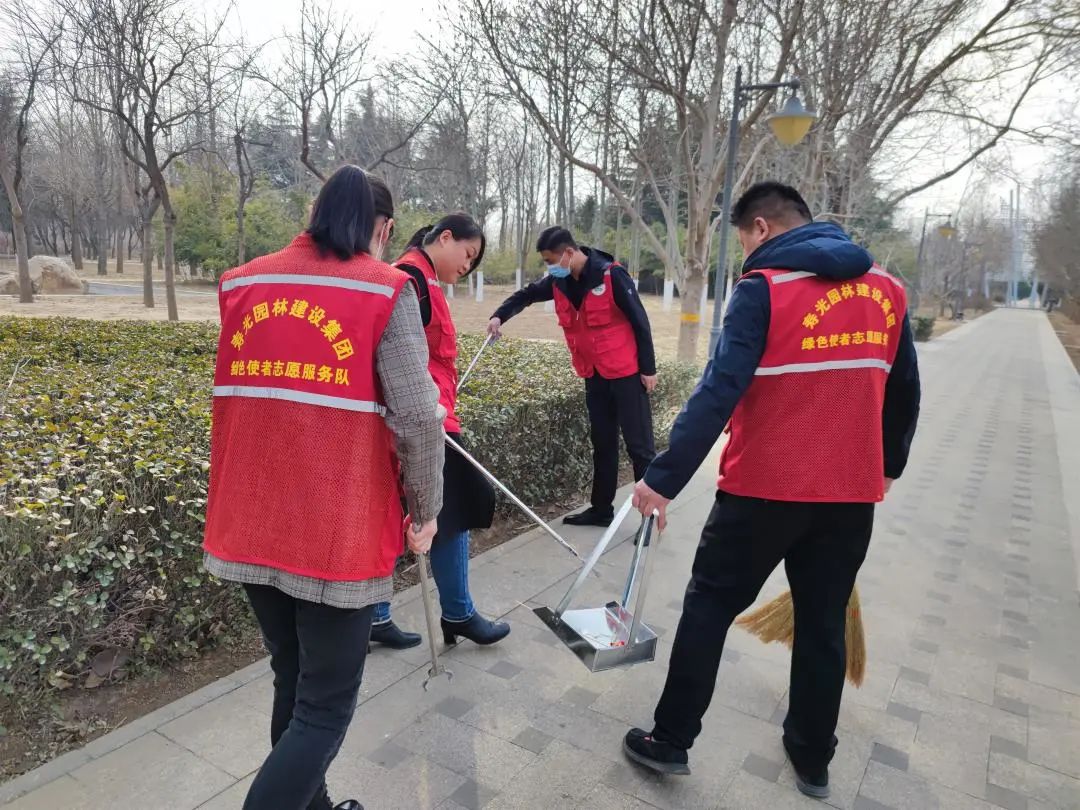 座谈会后,大家分发扫把、夹子、垃圾袋等工具,来到五色土广场附近进行卫生清理,一个个充满朝气的红色身影活跃在公共设施、绿地周边,一朵朵文明之花绽放在料峭的春风里,为初春的公园增添了生机与活力。