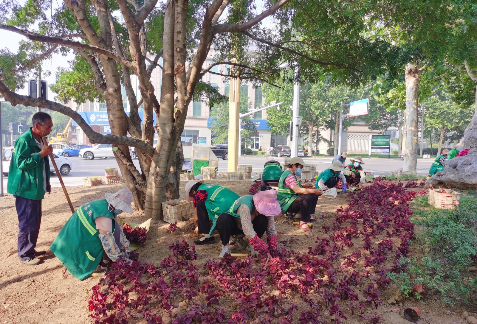 6月24日,在圣城街东段两侧绿地内,随处可见正冒着高温劳作的园林工人,他们栽植花草、疏剪苗木、修整树穴或绿地边界……整个现场井然有序,一派热火朝天的景象。在园林工人的忙碌中,道路两侧绿地景观更加精致靓丽。