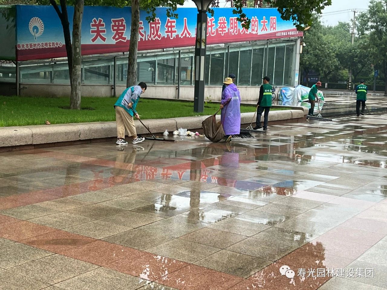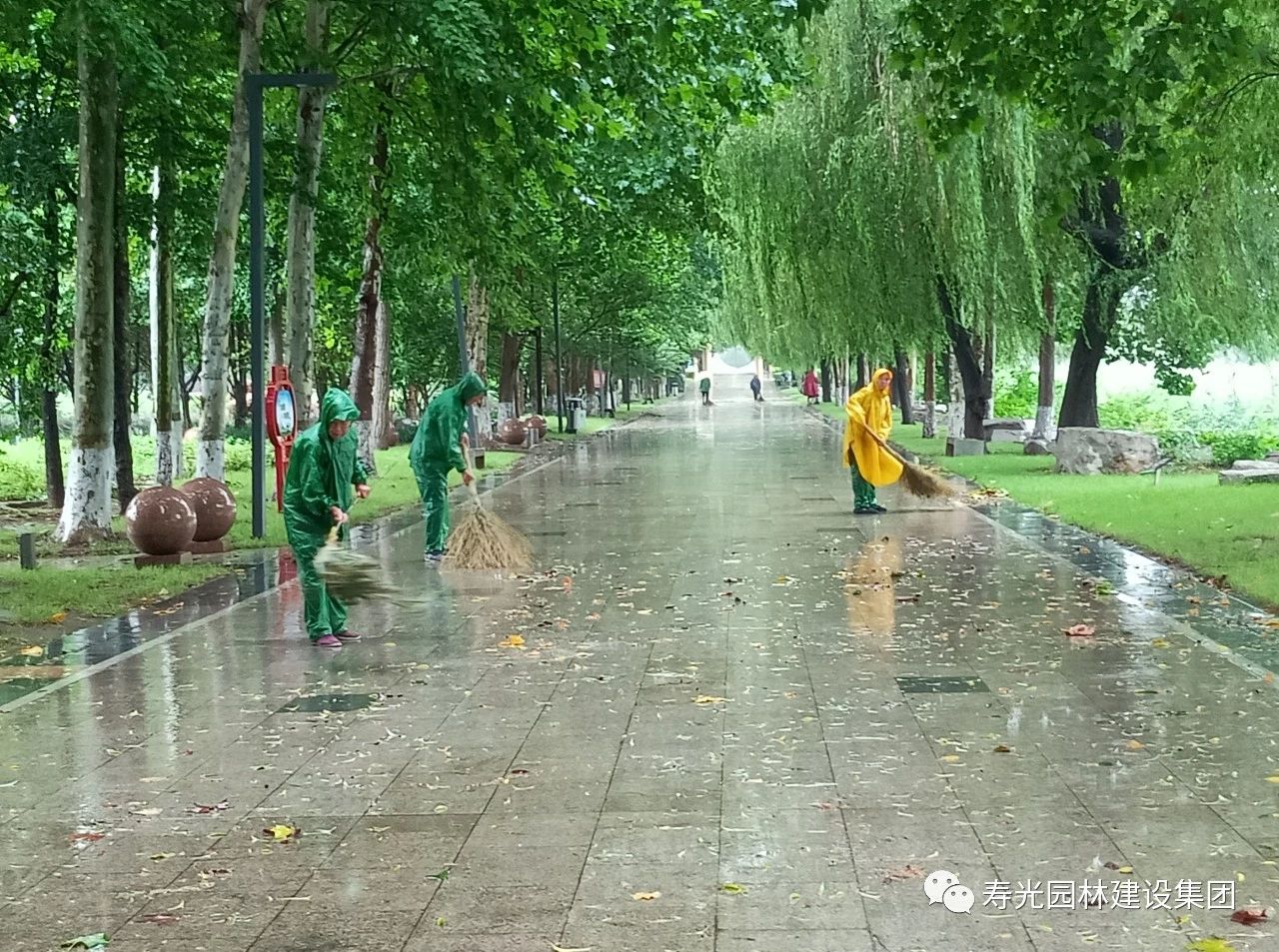 每次雨情,对园林工作来说都是一次随机考试。为应对恶劣天气,寿光园林建设集团制定了科学规范的应急机制,雨中不间断巡查园区及道路绿地,防止断枝、倒伏树木给交通出行造成影响;对落叶、落花密集区域加大清扫力度,并及时清运,避免积水;雨后及时进行园区清扫,保障园区环境洁净,这已经成为园林工人的一项常态化工作。
