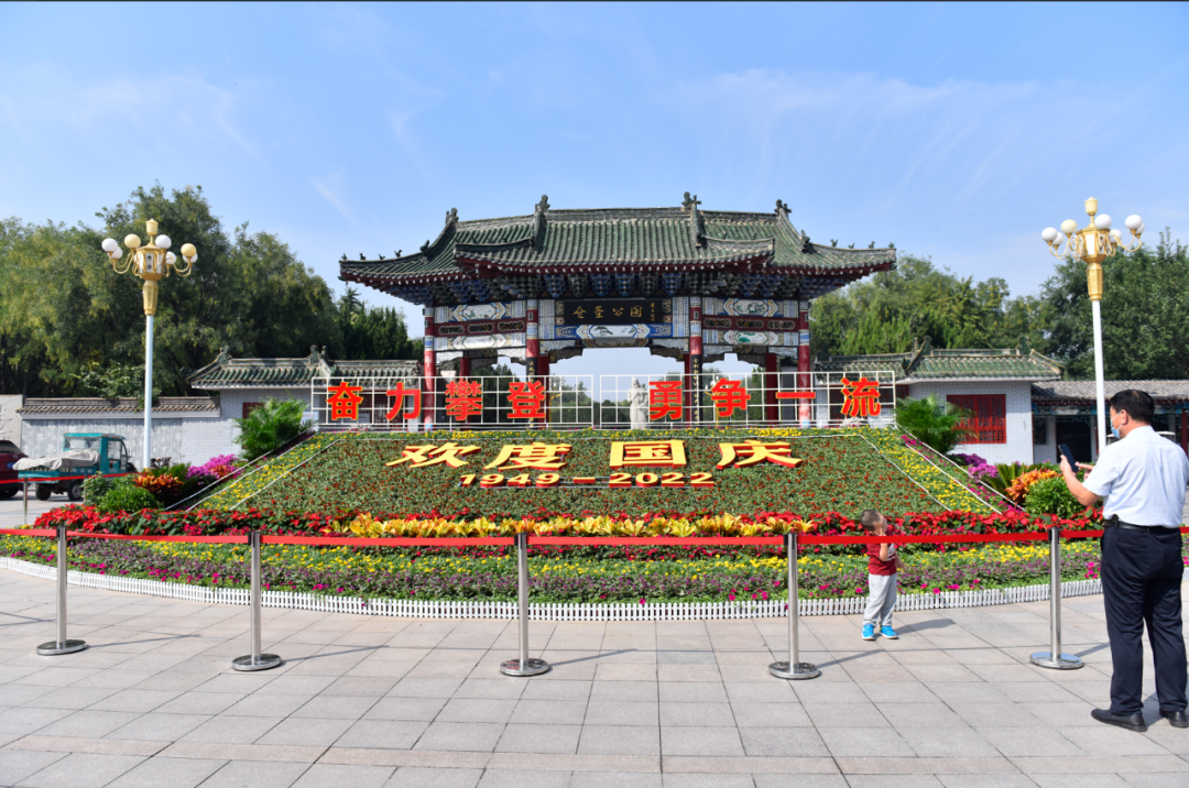 在商务小区入口广场,一个巨大的红色灯笼迎风而立,上面写着“祝福祖国”四个大字,灯笼下方是以万寿菊、三角梅、铁树、海棠花、彩叶草等鲜花、绿植构成的花境,一朵朵、一盆盆,在风中摇曳生姿,美不胜收。此处花坛以中国传统元素之一的红灯笼为主景,大红灯笼渗透着中华民族特有的丰富文化底蕴,灯笼基部的心寓意着我心向党,喜庆二十大奋进新征程,体现了全市人民全心全意跟党走奔向美好明天的坚定信念。