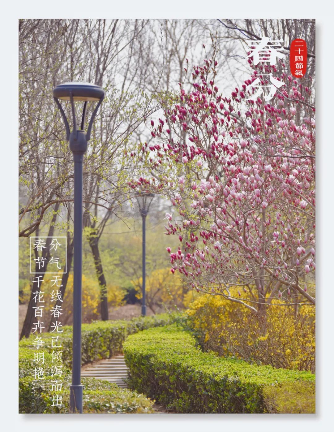 莺飞燕舞风和煦,春来处处百花香。今日春分,“ 春分者,阴阳相半也,故昼夜均而寒暑平”。春天的风已经拂过了寿光,美人梅、榆叶梅、紫叶李、连翘、玉兰......各类春花争相绽放在城市的每一个角落。公园里繁花似锦,处处鸟语花香,好一派明媚的仲春景象。近年来,寿光市在城市绿化建设中不断丰富绿化植物种类,合理种植季相变化明显的色叶植物和开花灌木,实施精细化绿地养护管理,打造出城市绿化特色,让城市达到“三季有花、四季常绿、移步易景”的城市绿化效果。当前,寿光市春季城市园林开花苗木品种已达到200余种。